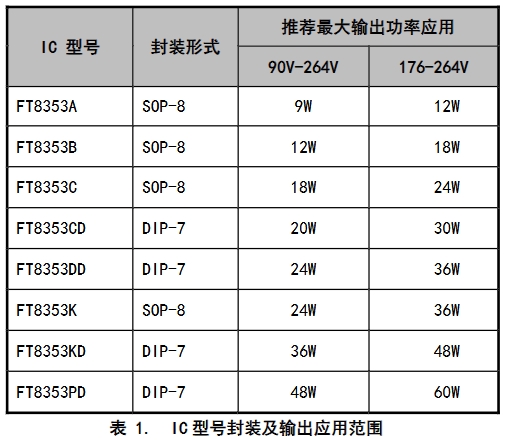 • FT8353KD:DIP-7封裝,推薦最大輸出功率達到36W,在176-264V輸入電壓下,適用于高功率LED照明產品,如大功率LED投光燈、T8燈管等。