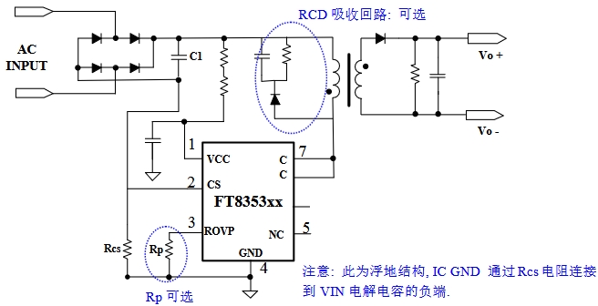 在該電路中,AC輸入電壓經過整流濾波后,為FT8353xx芯片供電。VCC腳接收供電電壓,CS腳通過Rcs電阻采樣電感電流,實現恒流控制。ROVP腳根據需要設置輸出過壓保護。GND腳連接到VIN電解電容負端,為芯片提供穩定的參考地。C腳與變壓器相連,將功率傳輸到次級側,為LED負載提供驅動電壓和電流。此外,電路中還可選配RCD吸收回路,用于抑制變壓器漏感引起的電壓尖峰,保護芯片和電路的穩定運行。