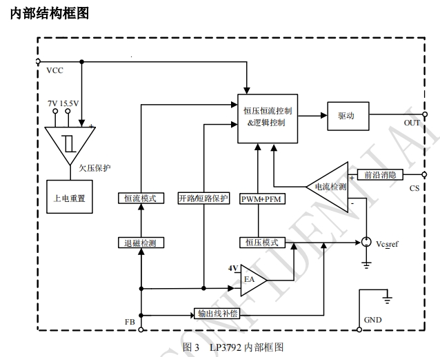 在恒壓模式下,LP3792通過采樣輔助繞組的平臺(tái)電壓,并與內(nèi)部基準(zhǔn)電壓進(jìn)行比較,形成閉環(huán)控制,從而精確調(diào)節(jié)輸出電壓。其恒壓精度高,能夠確保輸出電壓在各種輸入電壓和負(fù)載條件下的穩(wěn)定性。在恒流模式下,芯片逐周期檢測(cè)電感的峰值電流,并通過CS端與內(nèi)部閾值電壓進(jìn)行比較,當(dāng)達(dá)到設(shè)定閾值時(shí)關(guān)斷MOS管,實(shí)現(xiàn)精確的恒流控制。這種高精度的控制方式對(duì)于需要嚴(yán)格控制充電電流的設(shè)備,如手機(jī)、平板電腦等,至關(guān)重要,能夠有效保護(hù)電池,延長(zhǎng)其使用壽命。