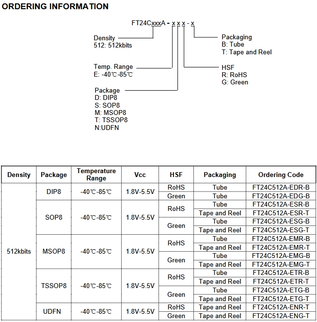 FT24C512A-ETR-T是一款512K位(65,536字節(jié))的串行EEPROM芯片,采用標(biāo)準(zhǔn)的兩線雙向串行接口。它支持1.8V至5.5V的寬電壓范圍,適用于多種低電壓和低功耗應(yīng)用。該芯片具有128字節(jié)的頁寫模式,支持部分頁寫操作,確保數(shù)據(jù)寫入的靈活性和高效性。