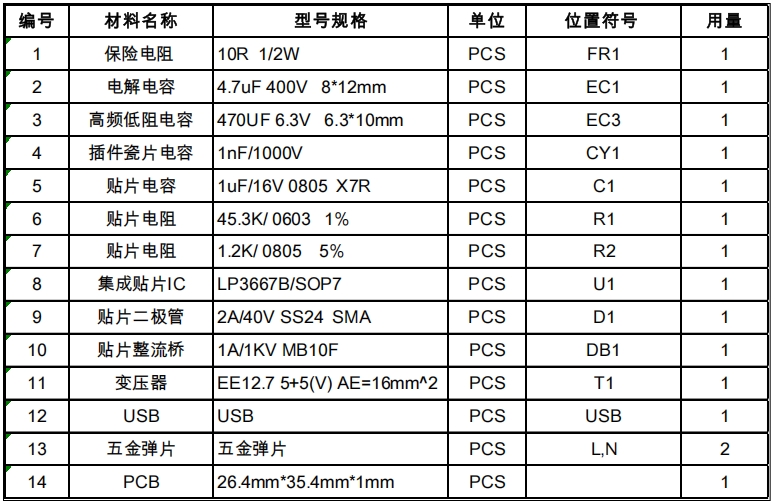 物料清單是實現電路設計的基礎,它詳細列出了電路中所使用的各種元件及其規格型號。在 LP3667B 5V1A 充電器的 BOM 表中,涵蓋了保險電阻、電解電容、高頻低阻電容、瓷片電容、貼片電阻、集成貼片 IC、貼片二極管、貼片整流橋、變壓器、USB 接口、五金彈片以及 PCB 等多種元件。例如,保險電阻采用 10R 1/2W 的規格,用于電路的過流保護;電解電容選用 4.7uF 400V 的型號,用于輸入濾波;高頻低阻電容則采用 470uF 6.3V 的規格,用于輸出濾波,以降低輸出紋波。這些元件的合理選型和搭配,共同構成了一個高效、穩定的充電器電路。