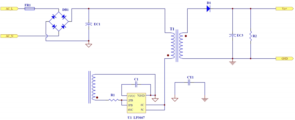 充電器的電路設計是其核心部分,其電路圖展示了各個元件的連接關系和功能。從電路圖中可以看出,該設計采用了典型的開關電源架構,主要包括輸入整流濾波電路、主控芯片 LP3667B、變壓器 T1、輸出整流濾波電路以及保護電路等關鍵部分。輸入整流濾波電路將交流輸入轉換為直流,并通過濾波電容去除高頻噪聲,為后續電路提供穩定的直流輸入。主控芯片 LP3667B 作為整個充電器的“大腦”,負責控制開關頻率、占空比以及實現各種保護功能,確保充電過程的安全與高效。變壓器 T1 是實現電壓轉換和電氣隔離的關鍵元件,其三繞組結構能夠有效降低電磁干擾并提高轉換效率。輸出整流濾波電路則將變壓器次級輸出的高頻脈沖轉換為穩定的直流輸出,并通過濾波電容去除輸出紋波,保證輸出電壓的純凈度。