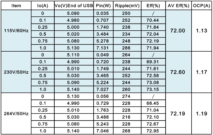效率是衡量充電器性能的重要指標之一。根據測試數據,在不同輸入電壓和負載條件下,該充電器的效率表現較為出色。例如,在輸入電壓為 115Vac/60Hz 時,滿載效率達到 72.00%;而在輸入電壓為 230Vac/50Hz 時,滿載效率為 72.60%。這表明充電器在不同工作條件下都能保持較高的轉換效率,減少了能量損耗,提高了能源利用率。