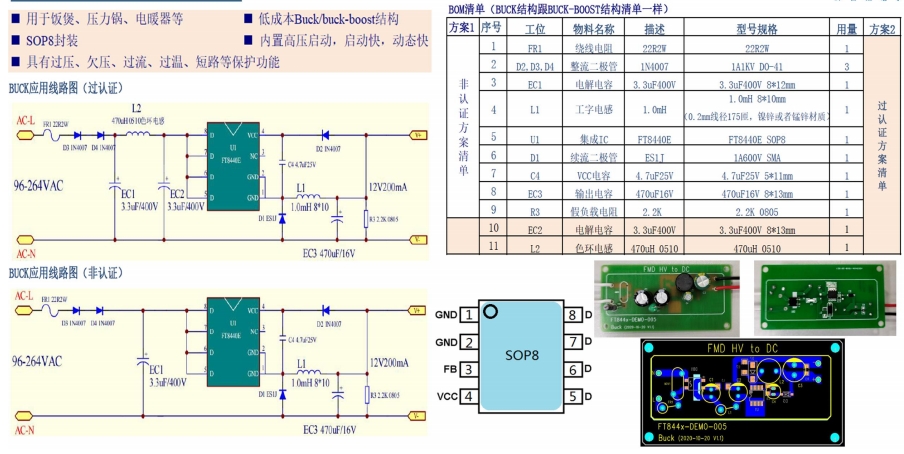 FT8440E芯片SOP8封裝,用于飯煲、壓力鍋、電暖器等低成Buck/buck-boost結構,內置高壓啟動,啟動快,動態快具有過壓、欠壓、過流、過溫、短路等保護功能。