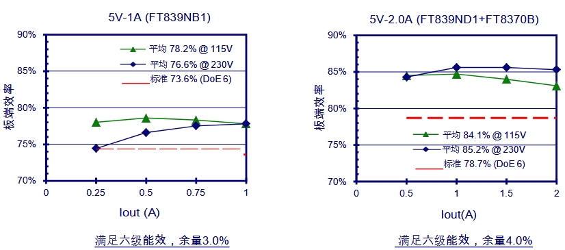 FT839xx/FT8393xx系列芯片在設(shè)計上充分考慮了能效優(yōu)化,能夠輕松滿足DoE和CoC六級能效標準。以FT839NB1為例,在115V和230V輸入電壓下,其平均效率分別達到了78.2%和76.6%,遠高于標準要求的73.6%,且余量達到了3.0%。這意味著在實際使用中,該芯片不僅能夠高效地將電能轉(zhuǎn)換為設(shè)備所需的能量,還能在不同負載條件下保持穩(wěn)定的能效表現(xiàn)。