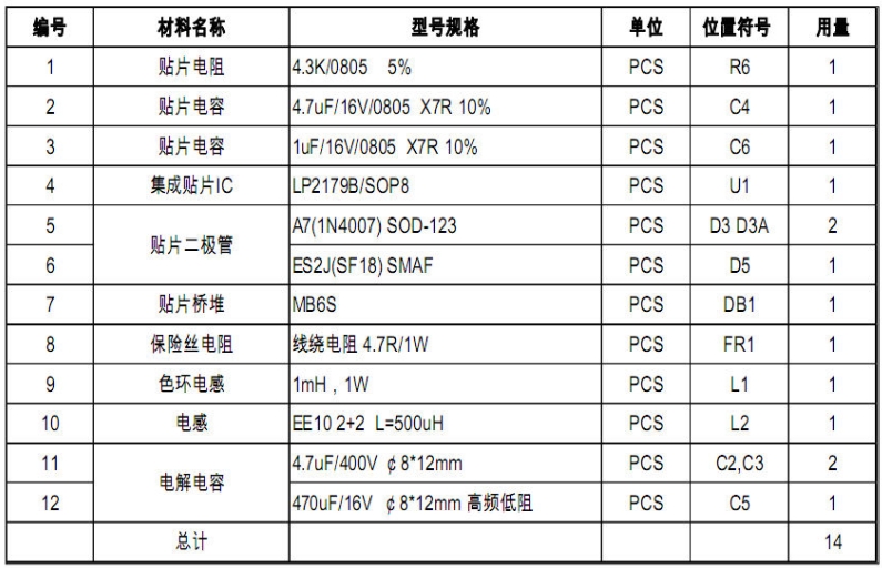 該電源方案的 BOM 表詳細列出了所需的各種元件及其規格和用量。其中包括貼片電阻、貼片電容、集成貼片 IC、貼片二極管、貼片橋堆、保險絲電阻、色環電感、電感、電解電容等。這些元件均為高品質的電子元件,能夠確保電源的穩定性和可靠性。通過合理的元件選擇和用量控制,該方案在保證性能的同時,也具有較高的性價比。
