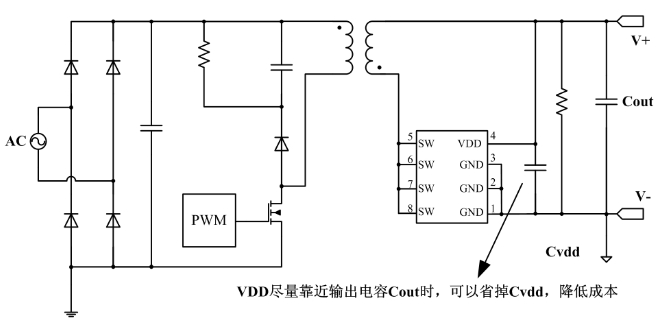 PL3331 的典型應用電路圖展示了其在反激式開關電源中的簡潔而高效的連接方式。在圖中,輸入電壓(V+)通過變壓器連接到 PL3331 的 SW 管腳,而輸出電壓則通過電容(Cout)進行濾波。為了確保系統的穩定運行,PL3331 的 VDD 管腳需要連接到一個穩定的電源,通常是從輸出電壓中獲取。此外,為了降低成本,當 Cvdd 盡量靠近輸出電容 Cout 時,可以省略 Cvdd。