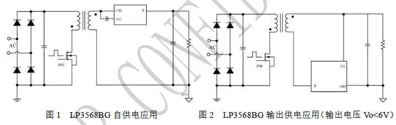 在自供電應(yīng)用中,LP3568BG通過其D腳連接輸出電壓,利用內(nèi)置MOS的體二極管對(duì)輸出電容充電,實(shí)現(xiàn)自供電啟動(dòng)。當(dāng)VCC電壓達(dá)到開啟閾值時(shí),芯片內(nèi)部控制電路開始工作,MOS管正常導(dǎo)通和關(guān)斷,電流從MOS管的溝道流過,而非體二極管,從而實(shí)現(xiàn)高效的同步整流。這種應(yīng)用方式適用于需要簡(jiǎn)化電路設(shè)計(jì)、減少外部電源依賴的場(chǎng)景。