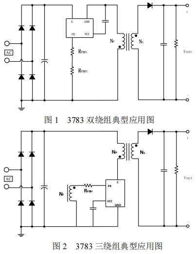 三繞組應(yīng)用是3783系列芯片的另一種典型應(yīng)用方式,其典型應(yīng)用電路如圖2所示。在這種應(yīng)用中,3783芯片的FB腳通過變壓器輔助繞組和FB腳的外置電阻反饋輸出電壓,與內(nèi)部基準比較形成閉環(huán),從而恒定輸出電壓。