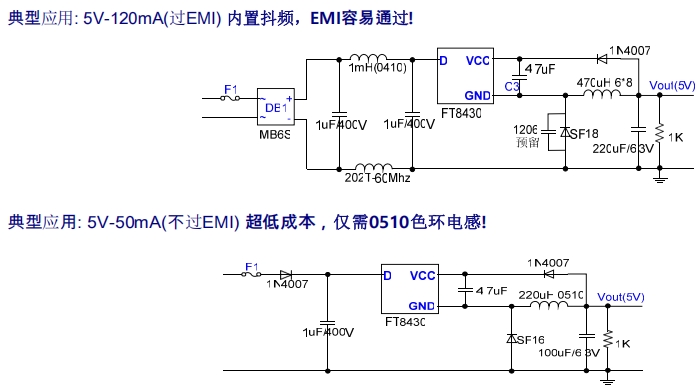 對于一些對EMI要求不高的小家電設備,如小型風扇、泡茶機等,可以采用5V-50mA的應用電路。該電路僅需一個220uH的0510色環電感,成本極低,能夠滿足設備的基本供電需求。
