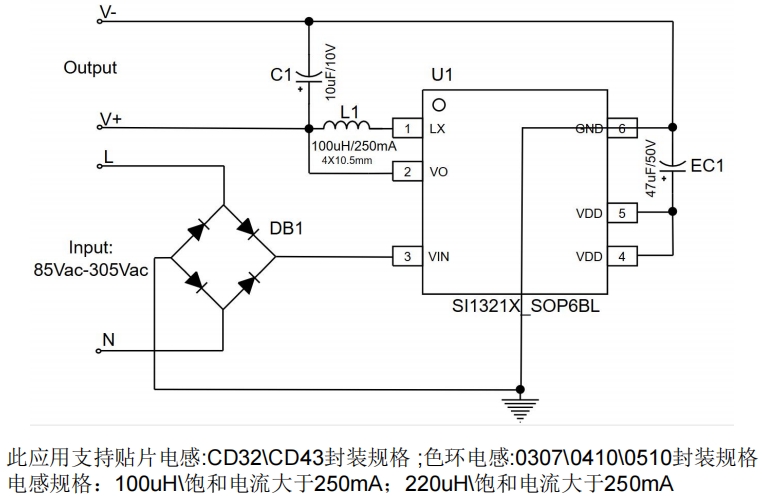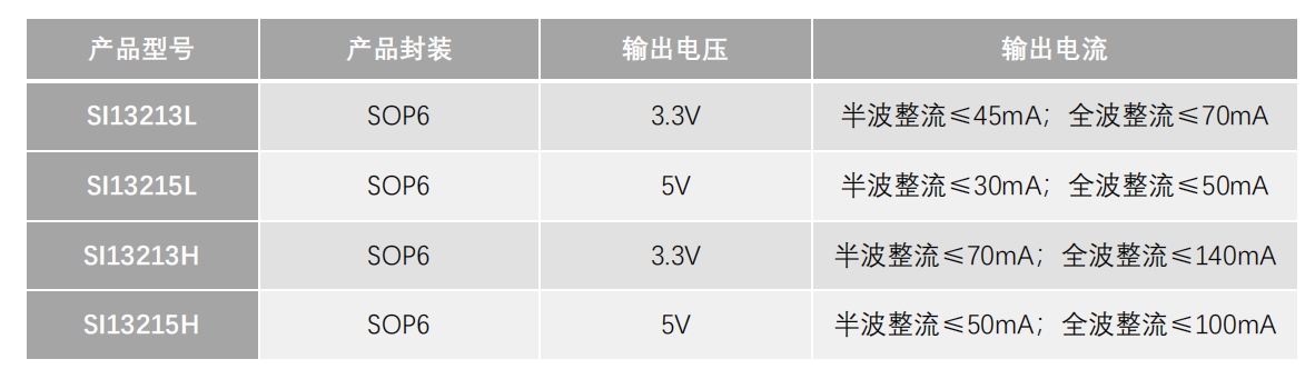 輸出電流:SI13213L在半波整流條件下的最大輸出電流為45mA(L版本)和70mA(H版本),全波整流條件下分別為70mA和140mA。SI13215L在半波整流條件下的最大輸出電流為30mA(L版本)和50mA(H版本),全波整流條件下分別為50mA和100mA。可見,SI13213L/H的輸出電流能力略高于SI13215L/H。