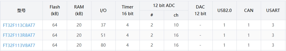 型號:FT32F113C8AT7/FT32F103C8AT7, FT32F103R8AT7/FT32F113R8AT7, FT32F113V8AT7