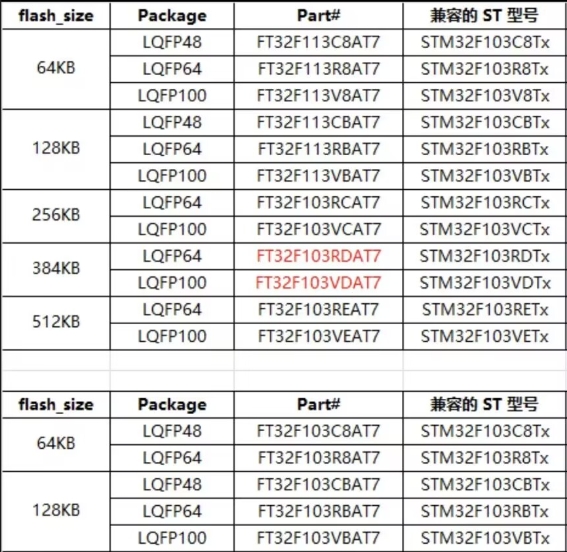 | FT32F103RBAT7 | 128 KB | 20 KB | 72 MHz | 與 STM32F103RB 一致 | 幾乎零差異 |