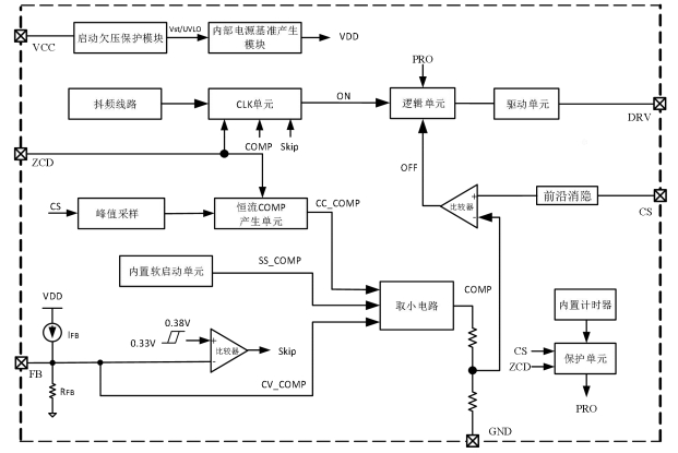 MPCM(最小峰值電流調制):當 FB 電壓 < 0.8 V 并持續 1 ms 時,芯片自動抬高 CS 參考 200 mV,同時延展死區至 35 μs,實現“降頻不降功率”的平滑過渡。