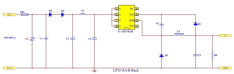 變壓器通過電磁感應將輸入的高電壓轉換為適合降壓轉換器處理的低電壓。在本方案中,變壓器將整流后的直流電壓轉換為適合LP2178B芯片處理的電壓水平,從而實現高效的降壓轉換。
