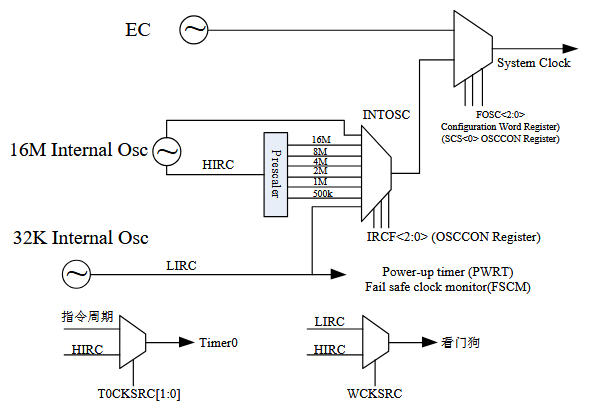 HIRC/LIRC → 時(shí)鐘選擇器 → CPU/Timer/PWM → GPIO → 外部世界
