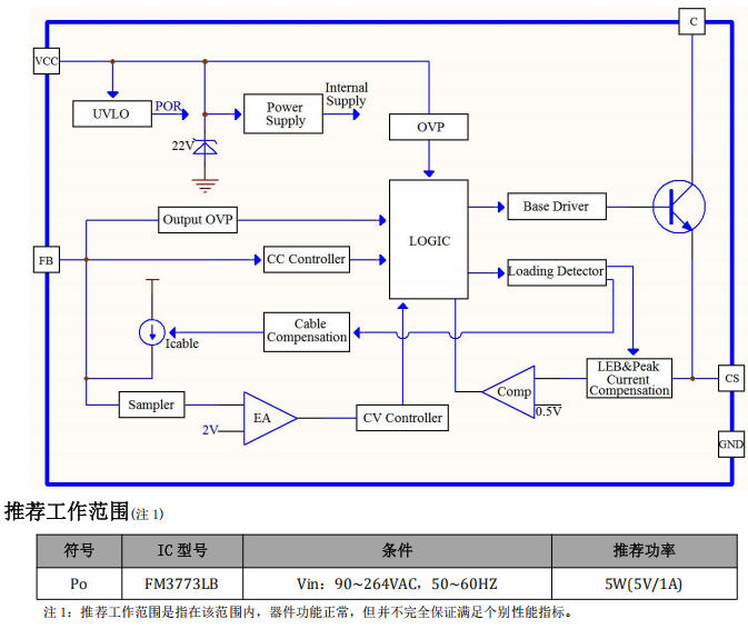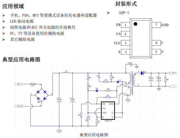 FM3773LB 是一顆 反激式隔離型原邊反饋(PSR)開(kāi)關(guān)電源芯片,內(nèi)部集成 850 V 大功率 BJT,采用 SOP-7 封裝,目標(biāo)功率 5 W(5 V/1 A)。最大亮點(diǎn):無(wú)需光耦、無(wú)需 TL431、無(wú)需次級(jí)電流檢測(cè),即可實(shí)現(xiàn) ±3 % 恒壓精度、±5 % 恒流精度,待機(jī)功耗 < 75 mW,專(zhuān)為手機(jī)充電器、LED 驅(qū)動(dòng)、機(jī)頂盒輔助電源等“空間小、成本低、交期緊”場(chǎng)景設(shè)計(jì)。