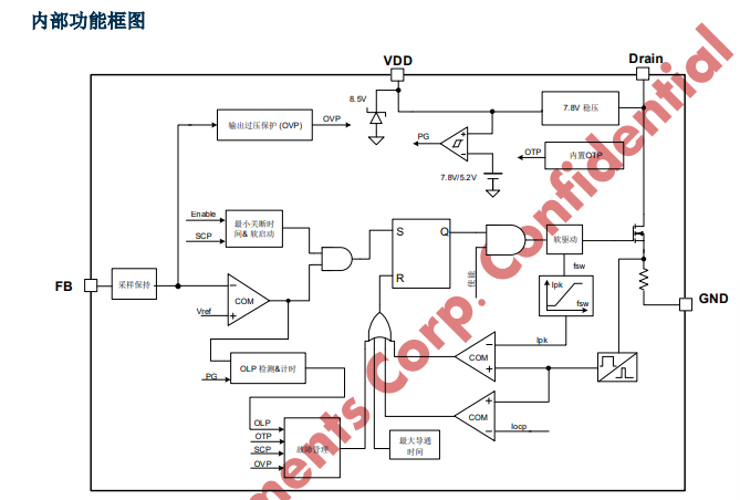 KP3114 集成有完備的帶自恢復(fù)功能的保護(hù)功能: VDD 欠壓保護(hù)、逐周期電流限制、輸出過壓保護(hù)、過熱保護(hù)、過載保護(hù)和 VDD 過壓保護(hù)等。