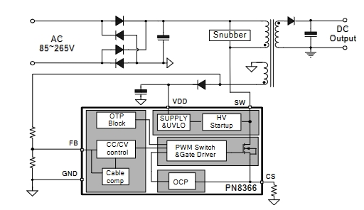 PN8366為原邊反饋工作模式,可省略光耦和TL431。內(nèi)置高壓啟動(dòng)電路,可實(shí)現(xiàn)芯片空載損耗(230VAC)小于30mW。在恒壓模式,采用準(zhǔn)諧振與多模式技術(shù)提高效率并消除音頻噪聲,使得系統(tǒng)滿足6級能效標(biāo)準(zhǔn),可調(diào)輸出線補(bǔ)償功能能使系統(tǒng)獲得較好的負(fù)載調(diào)整率;在恒流模式,輸出電流和功率可通過CS腳的電阻進(jìn)行調(diào)節(jié)。該芯片提供了極為全面的智能保護(hù)功能,包含逐周期過流保護(hù)、過壓保護(hù)、開環(huán)保護(hù)、過溫保護(hù)、輸出短路保護(hù)和CS開/短路保護(hù)等。