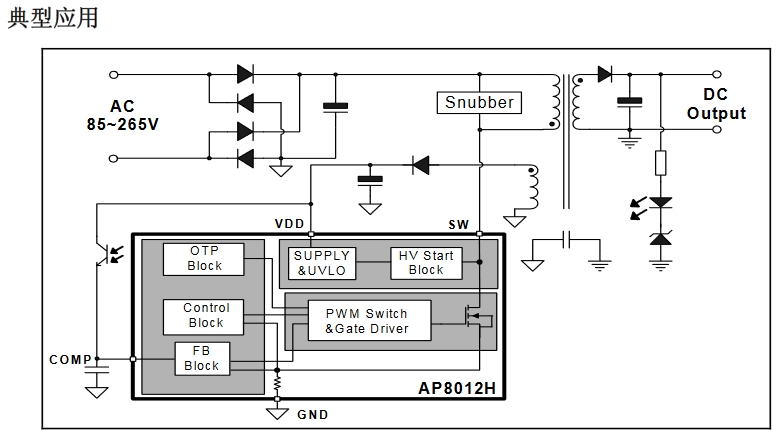 AP8012H芯片內部集成了脈寬調制控制器和功率MOSFET,適用于小功率離線式開關電源。該芯片提供了完整的智能化保護功能,包括過流保護,欠壓保護,過壓保護,過溫保護和軟啟動功能。間歇工作模式能夠降低系統處于待機模式時的功耗;抖頻技術有助于EMI特性。該芯片還內置高壓啟動模塊,保證系統能迅速啟動。