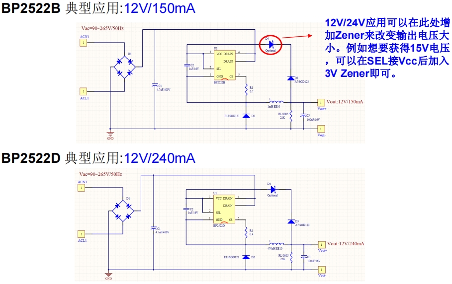 以BP2522B為例,其在12V輸出應(yīng)用中的典型電路設(shè)計(jì)如下: