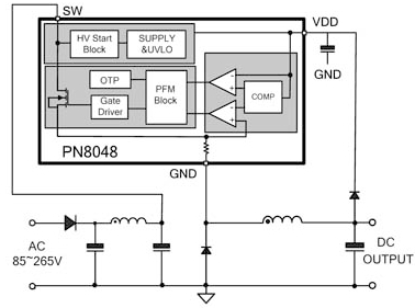 PN8048是一款專為移動設備設計的電源管理IC,它采用了先進的電源轉換技術,以實現高效率和低功耗。PN8048通常用于需要快速充電和高效率電源轉換的場合,如智能手機、平板電腦等。PN8048典型應用圖如下所示: